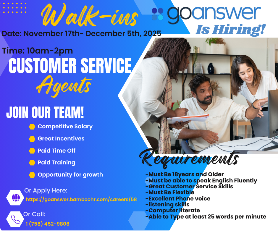 goanswer - Customer Service AgentsClosedNov 24, 20251 min readWalk-insDate: November 17th - December 5th, 2025Time: 10am-2pmOr Apply Here: https://goanswer.bamboohr.com/careers/58Or Call:1 (758) 452-9806